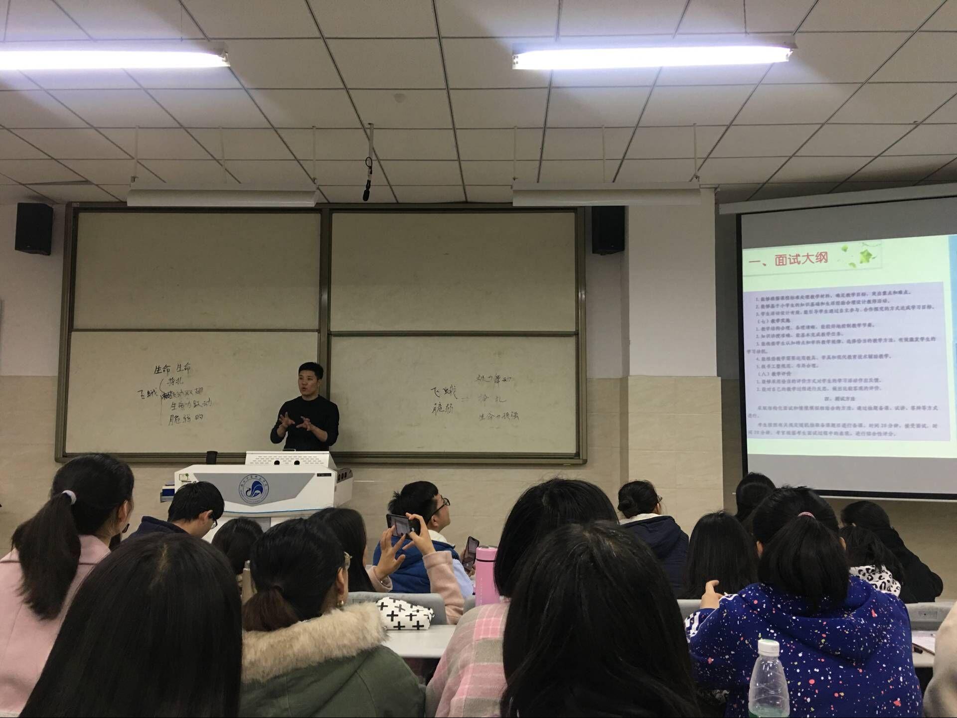 2018年11月28日下午,我院特别邀请陕西省特级教师、师德先进个人、优秀教学能手,陕西省校本研修先进个人,陕西省中小学幼儿园教师培训专家库专家,陕西师范大学锦园小学梁斌校长为2016级小学教育本科、2016级教育学本科、2017级小学教育专科即将参加资格证面试的近200名学生做了专场辅导,我院党总支肖新书记、高洁主任、史晓荣老师、李运福老师参加了讲座,讲座共分为三个部分,历时近三个小时。首先,梁校长通过提问指出教育最重要的两个方面,一是个人素养,二是课堂教学。同时讲述《中国学生发展核心素养》以及《全面深化新时代教师队伍建设改革意见》,进而强调习主席在全国教育大会讲话的“十大金句”。他从面试大纲、面试流程、备课与上课、礼仪规范、模拟面试等方面为大家进行了讲解。