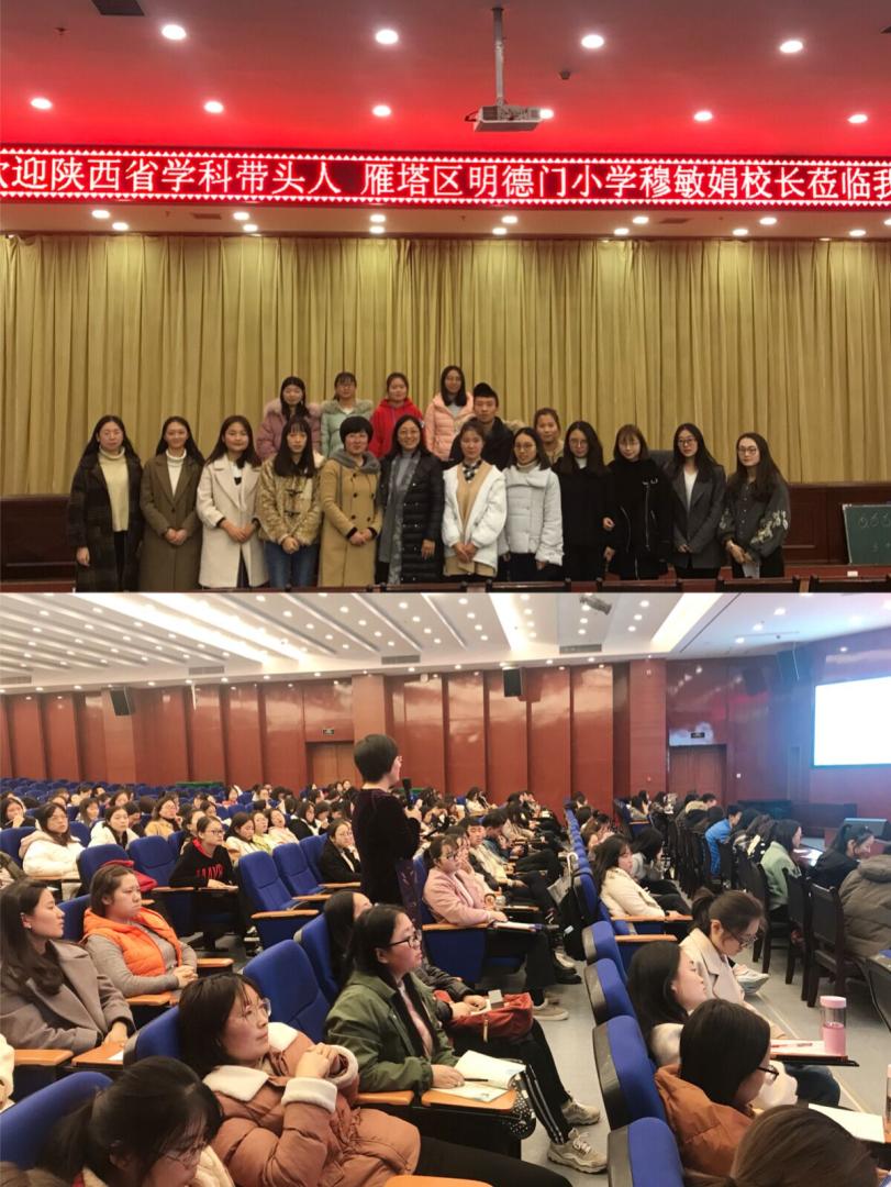 2018年11月16日下午14:30--16:30,陕西省学科带头人、雁塔区明德门小学穆敏娟校长莅临我院“师说论坛”,为我院2016级小学教育和2018级小学教育专升本近200名学生做了题为“我追求的理想课堂四部曲”专题讲座。本次讲座由我院吕银芳副院长主持。