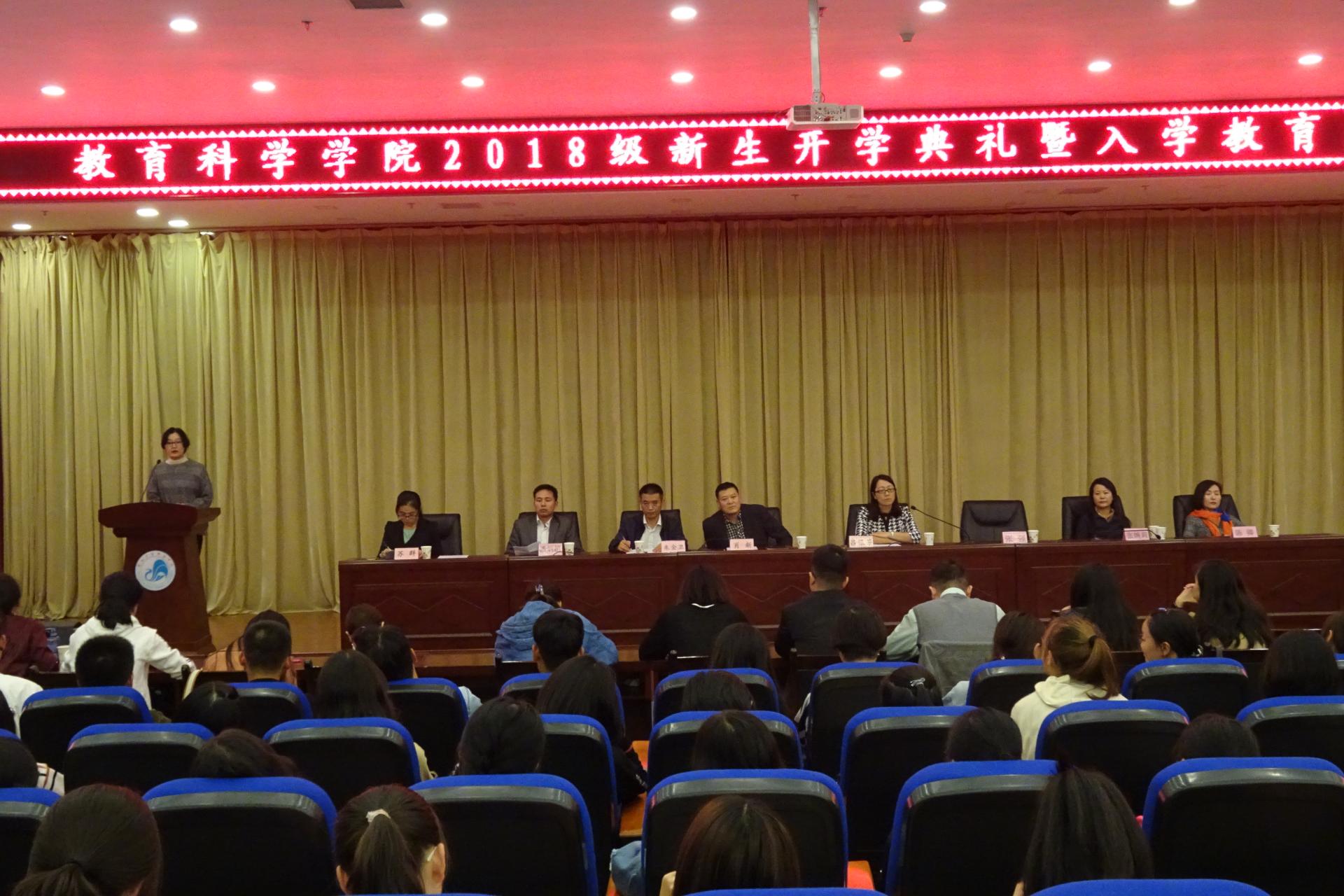 秋风送爽,丹桂飘香,我们首次迎来了新千年出生的千禧大学生,新时代、新学涯,十八岁的花样年华必定给人们带来无尽的遐想!经历激情似火的军训锤炼,2018级新生为自己的大学生涯交上了第一份合格答卷。在正式拉开大学学习生活之际,为了使同学们尽快适应大学生活,帮助学生树立大学意识、专业意识、学习意识,增强学生的使命感和责任感,9月26日下午,学院在我校学术报告厅隆重举行了2018级新生开学典礼暨入学教育大会。教科院党总支书记、副书记、副院长以及教师代表、辅导员、学生会干部参加典礼,与2018级全体新生共同见证这一庄严而神圣的时刻。会议由党总支副书记苏群主持。