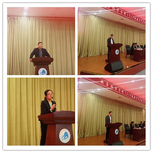 大会在高唱的国歌声中拉开序幕。苏副书记首先向同学们致以热烈欢迎,并有请朱金卫副院长对院情院况进行简要介绍,朱副院长围绕学院的历史沿革,专业发展历程和近几年取得重大成就及科研成果进行了简要的概述,并结合我院实践教学、理论精品课程与师资力量,向学生提出了殷切的希望,鼓励大家积极进取,奋发向上,争做国家栋梁之才。随后教科院心理学系主任陈卿老师、教育学系主任张强老师、课程与教学系主任潘炳超老师分别从专业特点、人才培养方案、培养目标、学习方法等方面进行了介绍,加快学生对所学专业的了解。辅导员李艳、张猛老师从学生管理角度对同学们的日常管理、学习生活、安全教育等方面提出希望和要求。2016级老生代表马新同学,2018级新生代表赵琼同学相继进行了精彩的发言,表达她们的感受与体会,体现了学生们珍惜大学美好时光、努力拼搏的决心。
