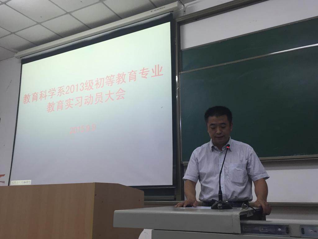 9月9日下午,教育科学系在一号教学楼C1教室组织召开2013级初等教育专业教育实习动员大会,系领导、实习指导教师、学生辅导员、我系新进教师、教学秘书和全体学生参加了动员大会。