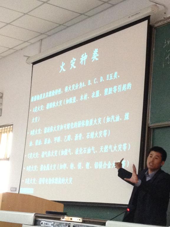 讲座开始,钟教官首先以众多的火灾案件为实例,告诉大家火灾引起的几大主要原因和预防火灾发生的重要性,提醒同学们在宿舍内要注意防止电器的过度使用,避免使用大功率用电器,实施安全用电便可预防宿舍火灾的发生。接着,钟教官提出安全事故的预防固然重要,但是一旦灾难发生,初期扑救也十分关键,同时还教给大家正确报火警的方法以及如何正确选择消防器材。钟教官说应该根据不同性质的火灾来选择不同的消防灭火器进行扑救。最后,钟教官强调火灾发生时最为关键的是自救逃生,他还通过PPT演示了不同的火灾场景,告诫大家火灾发生时千万不要慌张,应该保持头脑冷静,根据火灾情势判断逃生路径,积极利用各种防御物品来确保自身安全。