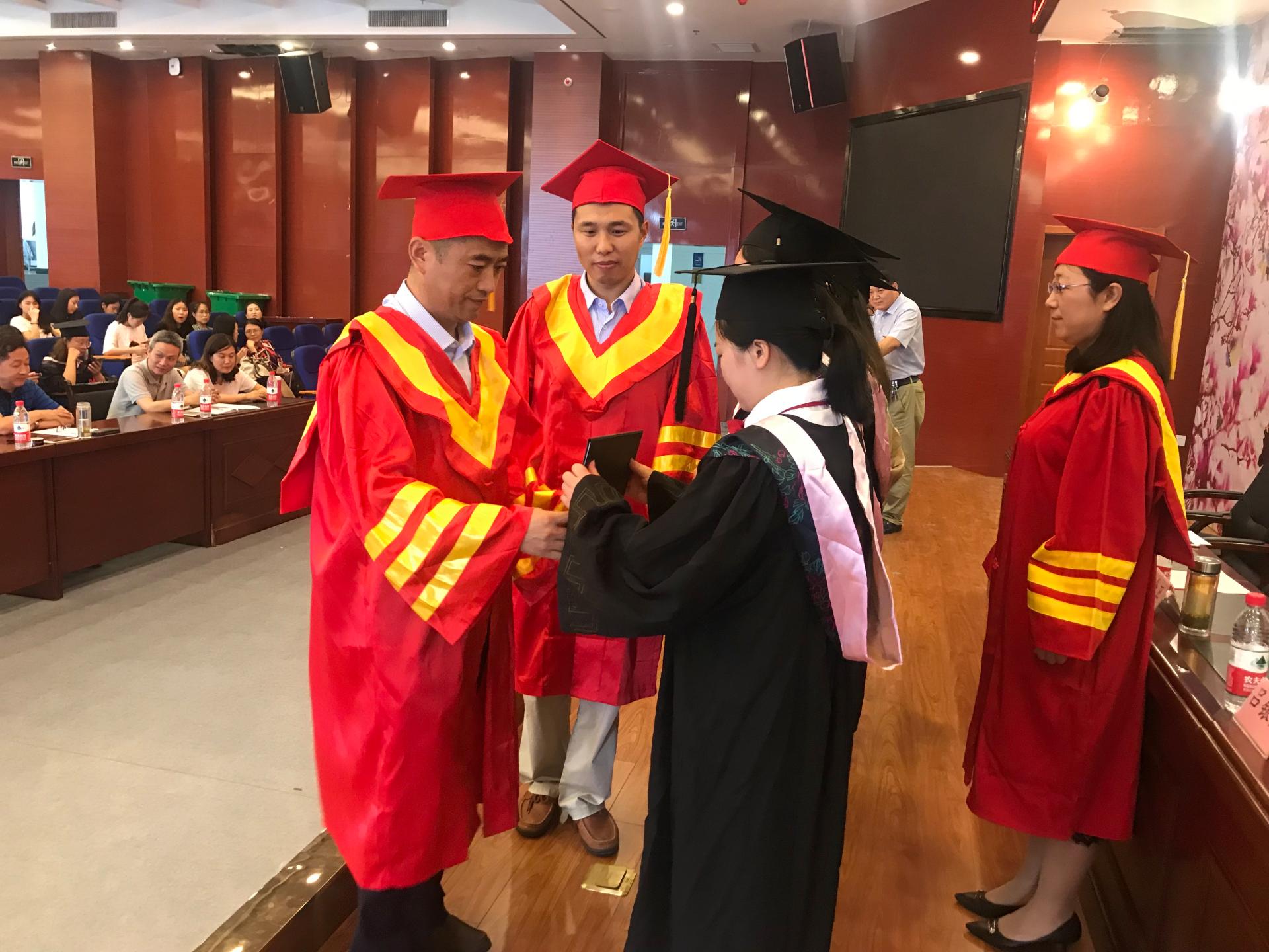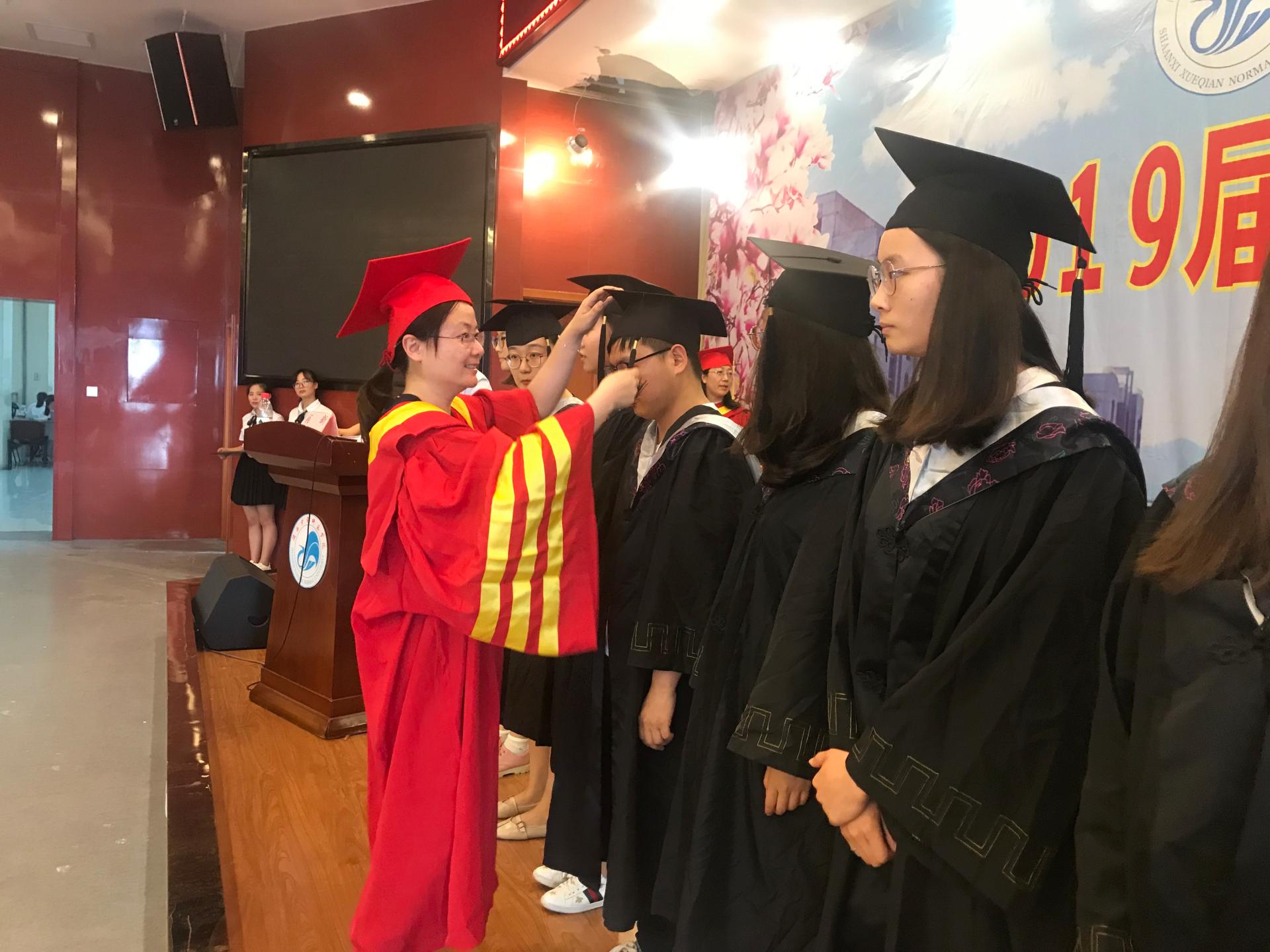 第二项,院长朱金卫、副院长吕银芳、副院长潘炳超及曲苒副教授分别为心理学和小学教育专业的毕业生扶正流苏并颁发教育学、理学学位证书,并合影留念。