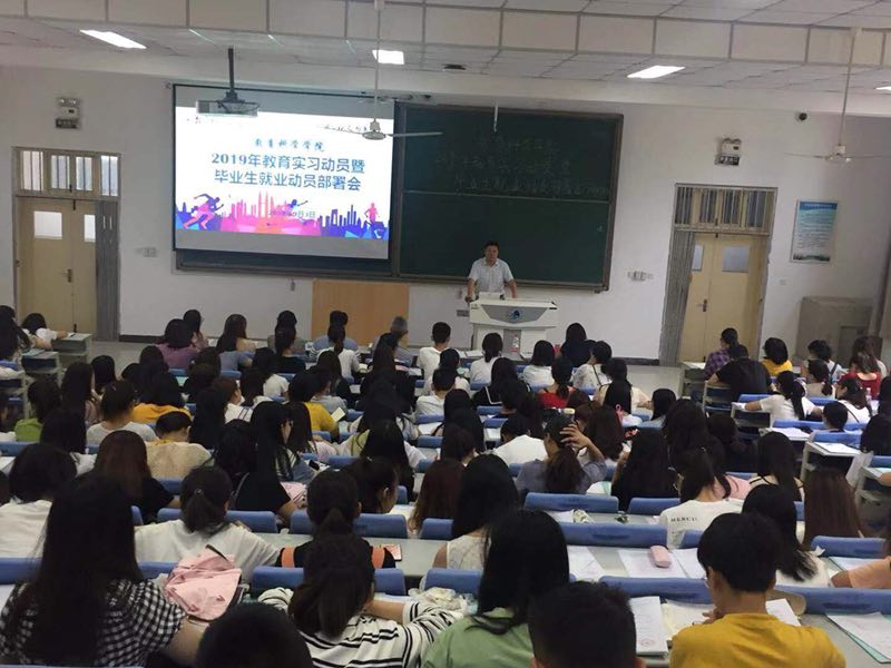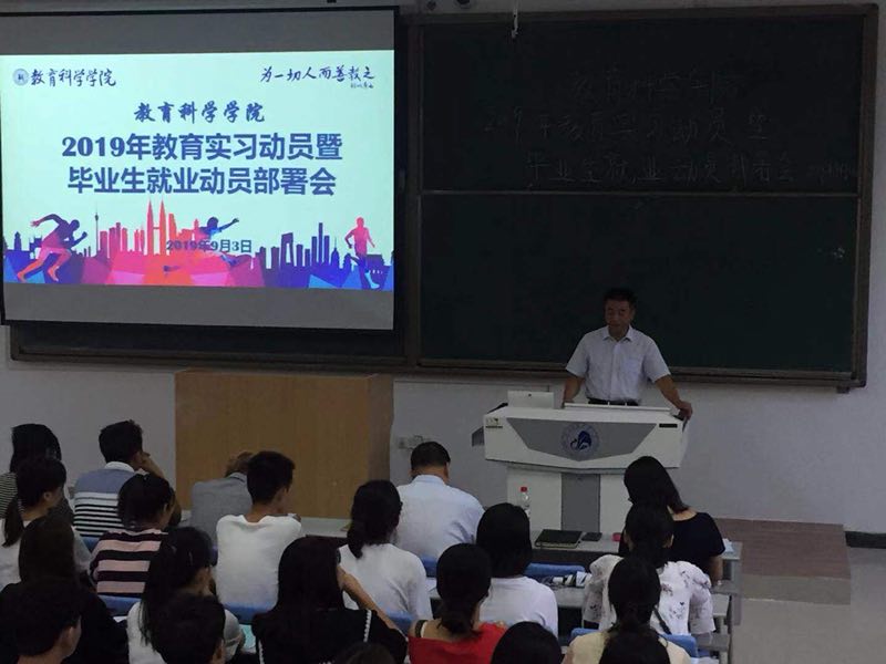 新学期开学伊始,我院就将2020届毕业生实习工作、就业工作提上重要议事议程,站在迎接合格的高度科学周密谋划、安排。为了明确要求、强化责任、营造氛围、有力推动,经过精心筹备,9月3日上午,学院在1教楼B1隆重召开了2020届毕业生教育实习暨就业动员大会。学院党政班子全体成员、全体辅导员、教师代表和2020届全体学生参加了会议。