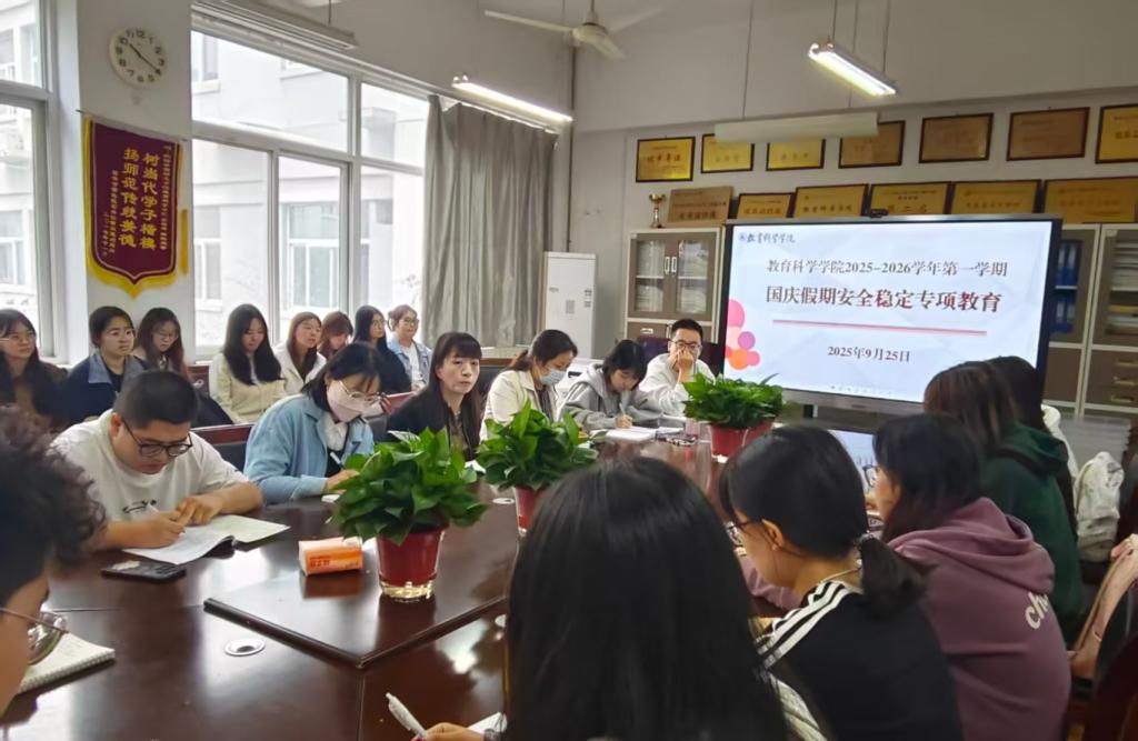 教科院就学生教育管理和安全稳定工作做了周密的安排和部署。一是制定《教育科学学院2025年国庆节前安全稳定工作实施方案》,强化职责、压实责任;二是加强学生的日常教育和管理,严格请、销假制度和考勤管理;三是全面开展安全稳定专项排查,持续完善对少数民族学生、心理问题学生、特殊学生、家庭经济困难学生、毕业生等重点群体的信息台账,做好学生关怀引导和家校共育;四是重点学习《陕西学前师范学院安全稳定工作管理规程》、辅导员工作相关要求、《宿舍卫生创建标准及宿舍行为规范》等文件材料,要求全体班子成员、辅导员和教师要高度重视,积极配合服从学校管理;五是进一步加强学风建设,倡导正确价值导向,对心理和特殊问题学生进行谈心谈话,为学生营造良好的学习生活氛围;六是不断优化细化学生安全稳定工作举措,通过实施“我在校园”每日打卡、周日晚点名、晚自习考勤、宿舍及特殊人群排查、学风督察等措施,精准掌握学生动态,对重点学生实施重点关注,不断培育学生养成良好的安全习惯,提高学生的安全意识、安全素养和避险能力。