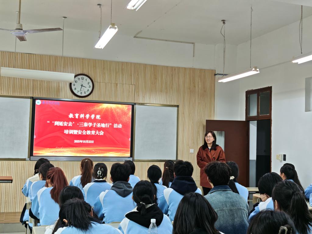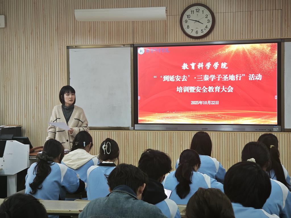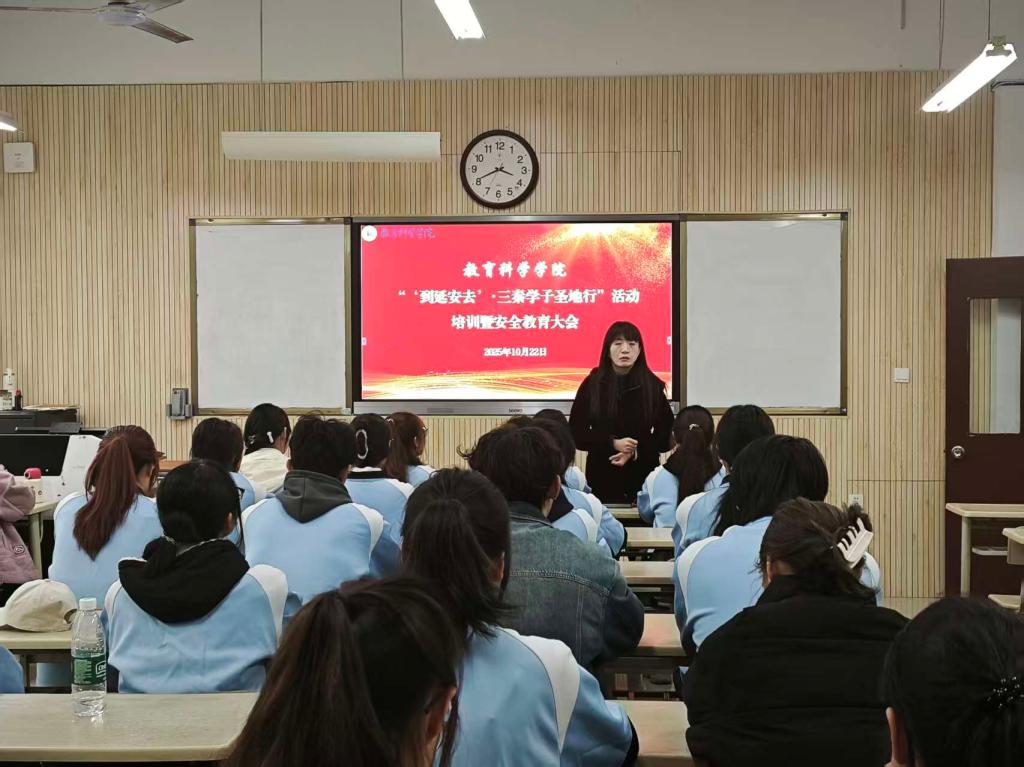 为确保“‘到延安去’·三秦学子圣地行”活动的顺利举行,帮助参与学生明确活动意义、熟悉行程安排、筑牢安全防线,10月22日下午,教育科学学院在1教A207教室开展“‘到延安去’·三秦学子圣地行”活动培训暨安全教育,学院相关领导、带队老师及42名出行学生共同参会。