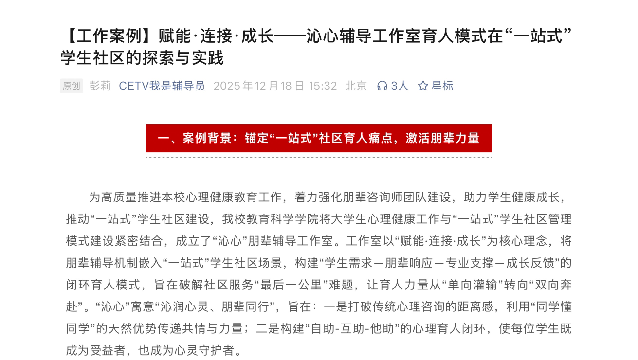 教育科学学院将以此次案例收录为契机,深化“沁心”朋辈辅导工作室品牌建设,持续完善“专业+实践”的朋辈培养体系,推动优质心理育人成果在“一站式”学生社区的辐射覆盖,为新时代高校思政工作与心理健康教育融合创新注入新动能。