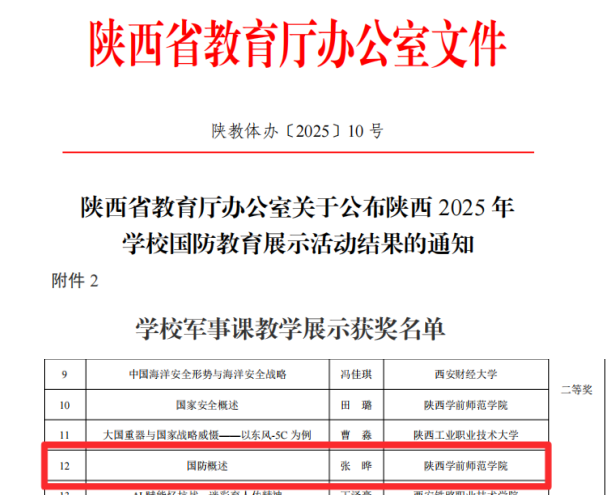 近日,陕西省教育厅组织开展的陕西2025年学校国防教育军事课教学展示赛结果揭晓。教育科学学院党委副书记张晔副教授,凭借扎实的教学功底与出色的现场表现,荣获陕西省学校军事课程教学二等奖(全省二等奖共8名)。
