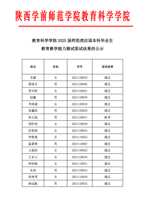 教育科学学院2025届师范类应届本科毕业生教育教学能力测试面试结果的公示