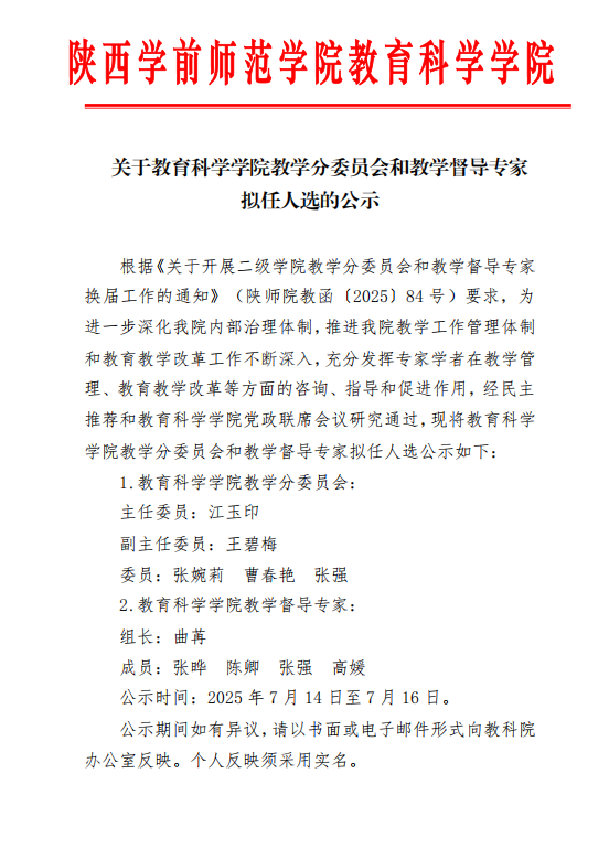 关于教育科学学院教学分委员会和教学督导专家拟任人选的公示