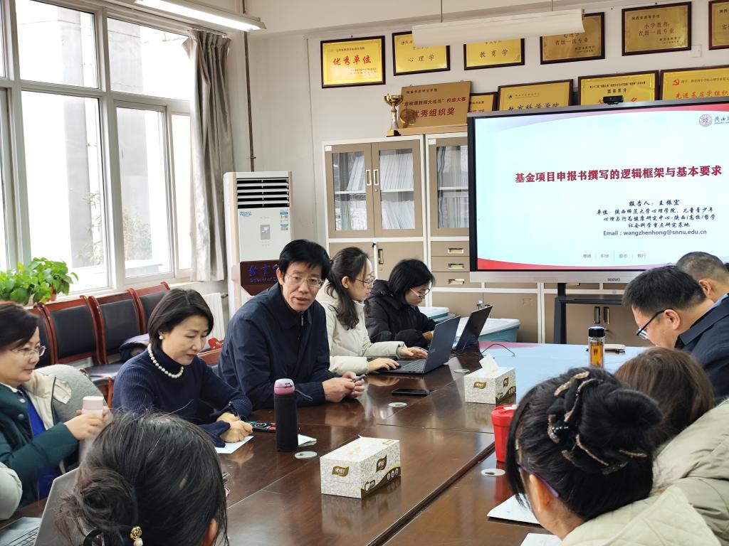 2026年1月14日上午,陕西师范大学心理学院原院长、陕西(高校)哲学社会科学重点研究基地-儿童青少年心理与行为健康研究中心主任、二级教授王振宏应邀做客我校“神禾大讲堂”第3讲,作了题为《基金项目申报书撰写的逻辑框架与基本要求》的学术报告。教育科学学院院长江玉印主持报告会,学校副校长李明军出席报告会,全体教师聆听报告并在会后参加座谈交流。